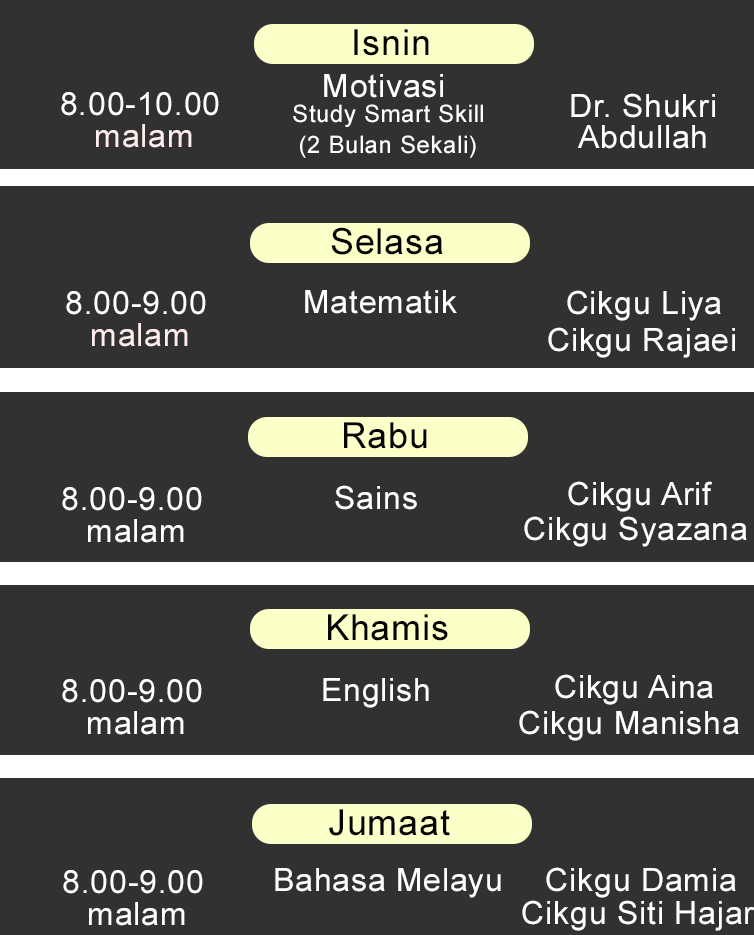 Bukan tutor biasa. Tenaga pengajar terdiri daripada Guru Sekolah , Ketua Panitia , Guru Pakar Subjek , Pensyarah Universiti